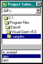 To select a project from the list of qualified projects, double click on the project of interest. Depending upon the status of the project, the various screens of GIANT's Graphical User Interface will be filled with information. For a project that is currently being worked on, GIANT would extract information from its *.CAM, *.GRP, *.COM files to refresh the fields of the GUI screens with the most current values. In a new project, none of the information will have yet been provided and GIANT would display the fields as blank. As work on the project progresses, values will be specified for the various parameters and stored in the corresponding data file. It is in this sense that it was remarked earlier that a GIANT project is defined by the collection of information in the input data stream and options files. If the project of interest is not found in the current device, directory specification, navigation to an alternative device or directory is simple. To select a new device, double click on the arrow to the right of the upper, device specification window. The list of available devices will drop down. Double click on the device of choice. In a similar manner, the directory specification can be changed using the middle window of the pop-up Selection menu. At the top of the middle window is the device specification. Double clicking on it will produce a list of all of the first-level subdirectories. Double-clicking on a particular first-level subdirectory will produce the list of second-level directories that fall beneath the chosen first-level subdirectory. Continue this process until the appropriate level of subdirectories is reached. Each time a new subdirectory is specified, GIANT will search for and present the list of any qualified projects that are found there. When a project selection is made, the pop-menu will disappear, and the Path window of the Graphical User Interface will refresh with the specification of the selected device and directory, and the Process Options screen will refresh with parameters from the selected project. As an illustration, suppose the current device, directory specification is C:\WINDOWS, and the GIANT project of interest is actually located in the D:\GIANT\PROJECTS\ALASKA subdirectory. Select the Browse button to generate the pop-up Selection menu. In its upper window, use the down arrow to produce the list of available devices, and click on device d:. The middle window will refresh with the list of first-level directories on the D: device. Click on the \GIANT directory. The window will then refresh with the set of second level subdirectories beneath the \GIANT directory. Select the \PROJECTS subdirectory. The bottom window will then refresh with the list of qualified projects, one of which will be ALASKA. Double click on ALASKA to select it as the project. The pop-up menu will then disappear and the Process Options screen will redraw with the corresponding parameters from the ALASKA project. When lists of devices or directories or projects are large, it may be necessary to use the scroll bar to the right to bring the sought item into view. It is entirely legal to specify a path to a removable or network device, for instance, A:\GIANT\PROJ_456\. The operation of the project selection feature of GIANT suggests one appealing logical disk architecture for project management: create a subdirectory for each GIANT project. Such an approach offers the advantage of keeping subdirectories comparatively small, and all information pertinent to one project in one, exclusive, central location. For instance, one sample path illustrated above was A:\GIANT\PROJ_456\. In that system there could be additional projects such as A:\GIANT\PROJ_455\ and A:\GIANT\PROJ_457\. This is only one suggestion of a viable project management architecture. The user is encouraged to experiment to determine the architecture which best suits his specific needs. An example of an invalid disk structure would be one in which all image files are gathered into one subdirectory, the frame files in another, the control files in a third, etc. |