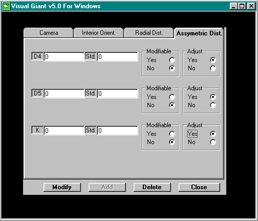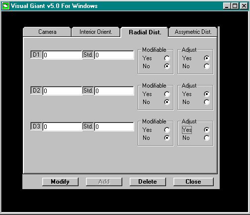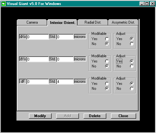 A cursory glance at the Camera Parameters screen shows the following features: Menu bar featuring Camera, Interior Orient, Radial Dist, Asymmetric Dist tabs Camera System and Principal Distance Windows Default Standard Deviations Window Interior Orientation, Radial Distortion, Asymmetric Distortion Switches Modify, Add, Delete, Close Buttons The various features provide numerous alternative approaches to camera management, although the likely sequence of operations would be to Add a camera definition, Modify it if one of the parameters is subsequently found to be inaccurate, and Delete it if the camera definition is no longer pertinent or accurate. Discussion of the camera management feature will follow this logical sequence. The Close Button is used to exit the Camera Management option and return to the Process Options Screen. Adding a camera to the Camera Definitions file requires the specification of the camera's name and parameters. Begin by typing a name in the Camera System field. As recommended earlier, it is advisable that the name of the camera discriminate not only between different physical devices but also between different attributes of the same camera. Enter the camera's focal length in micrometers (microns) in the Principal Dist field. Next, use the mouse to set the Interior Orientation, Radial Distortion and Asymmetric Distortion switches. Select the Yes setting if values of the parameters are known and to be applied or if values for the parameters are sought through GIANT's self calibration option. If parameter values are not known, not to be applied or not desired, select the No setting. The switches may be set to Yes or No in any combination. For completeness of this discussion all three options will be considered to be active as shown in the above illustration of the Camera Parameters screen. Selecting Yes to these options permits the entry or edit of the appropriate parameters through the functions specified on the upper menu bar. Selecting, to begin, the Interior Orientation tab of the menu bar refreshes the screen with the display shown, |