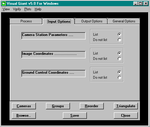 GIANT offers the user numerous features to custom configure the outputs generated by the triangulation. This flexibility is useful at all phases of the triangulation project: during the initial phases, detailed triangulation output which include data echoes can provide a means of quality controlling the input data stream in addition to the other verification tools. During the iterative cycle of data editing/re-calculating, GIANT's statistical information can simplify the analysis of the adjustment and assist in the location and removal of errors in the input data stream. In the final stages of the project, when the triangulation has been quality assured, GIANT can be configured to output, say, only the triangulated ground points in an ASCII format for convenient delivery to some other software package. Alternatively, GIANT could be configured to output only frame orientation information in a form convenient for use in setting stereomodels. This discussion of configuring GIANT's output will follow this start-to-finish project-phase sequence; however, the user should be aware that the configuration can be done in any arbitrary sequence. Suppose, first, that the user wishes to echo GIANT's input data stream. As discussed in detail in Chapter 2, GIANT's input data stream consists of three files: the Image File, the Frame File and the Ground Control File. To echo these values, from the Process Options Screen use the mouse to click on the Input Options to bring the Input Options Screen, shown below, to the front of the display, |