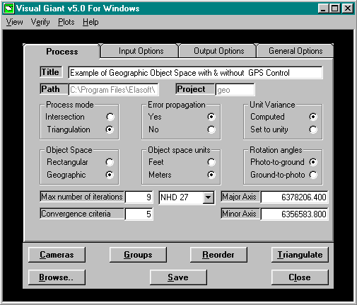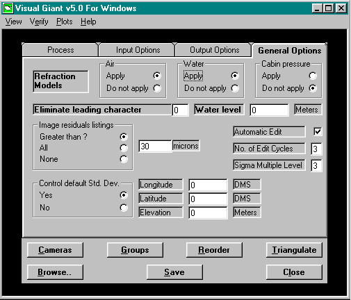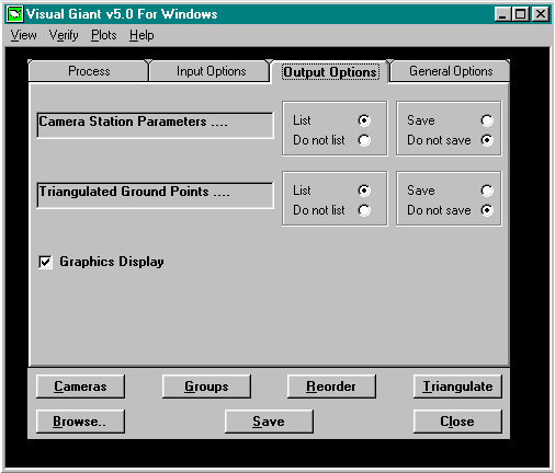 The current setting is simply changed by using the mouse to activate the button for the desired sense of rotation. Remember that this discussion has approached--strictly for convenience--GIANT output from the three facets of input echo, statistical support and output generation. This approach was entirely arbitrary: the user is free to select any one of the many combinations of input echoes, statistical support information and output features which best suit the needs of the project. Three general features regarding GIANT's output configuration remain. Use the mouse to bring the Process Options Screen to the front of the display. Notice that the topmost field on the screen is labeled Title. This field can be used to supply a descriptive title to the triangulation project. This title will be printed at the top of the output file. The output file is a generic ASCII file that can easily be imported into a word processor for formatting to user specification. Section 2.1 contained a discussion about the naming conventions for all of GIANTS entities: camera systems, groups, frames, images, etc. The convention has four aspects: